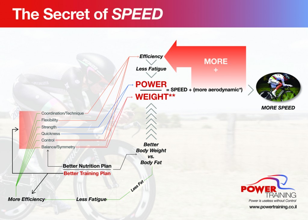 גמישות, כוח וגיוס יחידות מוטוריות בצורה יעילה. תתפלאו לגלות, כי רוכבי נג”ש מצטיינים בעולם, לא בהכרח מוציאים כל כך הרבה ואטים ביחס למשקל גוף (במישור בעיקר). רק מה ? יעילות הדיווש שלהם גבוהה מאוד (ובכך חוסכים בהרבה ואטים) > אחד המרכיבים העיקריים לפיהם אנחנו מתאימים אופניים ומאמנים, בנוסף לאותם רוכבים, הגמישות גבוהה – ובכך יכולת אווירודנמית טובה יותר.